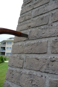 Op een afstandje ziet het voegwerk er meestal nog wel behoorlijk uit, maar een klap met de palm van de hand tegen een priem (of mes) die tegen het voegwerk is geplaatst, laat vaak zien, dat de priem (of mes) zomaar enkele centimeters ‘de diepte’ ingaat. Van een nuttige verbinding is in die gevallen geen sprake. En als dan het achterliggende metselwerk ook niet optimaal is, dan moeten we niet vreemd opkijken, dat bij de volgende storm weer een gevel wordt geveld door natuurgeweld.